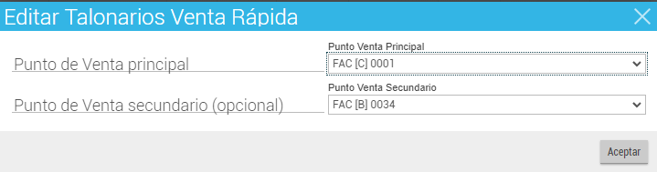 7) Seleccionar los puntos de venta que que desean asignar a la venta rápida en la ventana Editar Talonarios Venta Rápida.