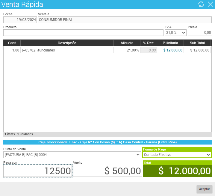 ♦ Una vez concluídos los pasos anteriores contarán con la función Venta Rápida lista para usar, observando que el cliente predeterminado sólo es el Consumidor Final, resultando así un proceso simplificado y ágil para la carga de aquellas ventas que no requieren de excesivos datos específicos.