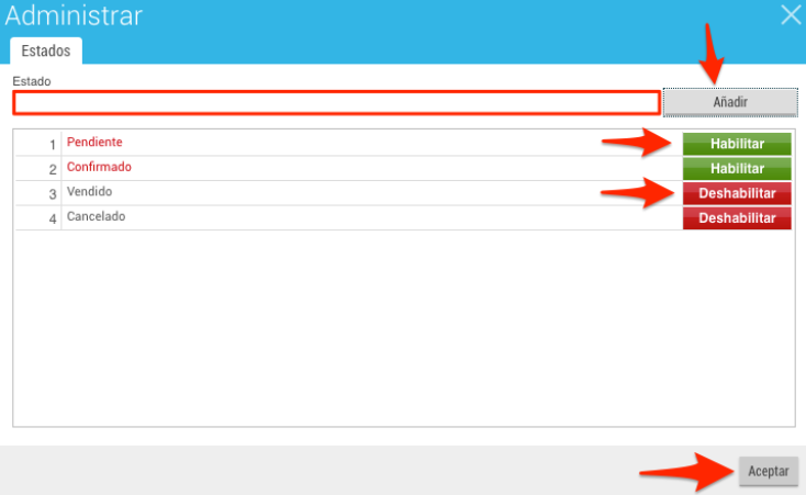 De esta manera entraremos a la ventana Administrar donde podremos agregar estados escribiendo el mismo en el campo correspondiente y luego haciendo clic en Agregar. También podremos habilitar o deshabilitar los existentes cliqueando en los botones que muestra la imagen de ejemplo.