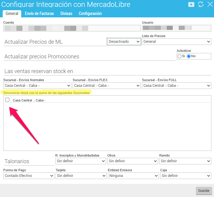 3) En la ventana Configurar Integración con MercadoLibre, para sincronizar el stock tiene que haber una o más sucursales seleccionadas.