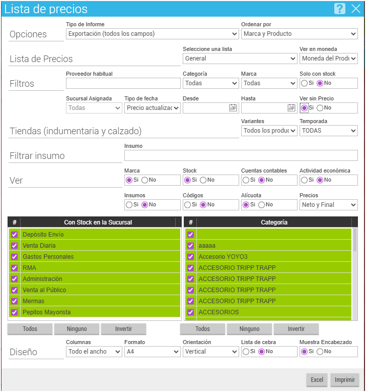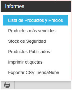 2) Descargar un archivo con todos los productos, cliqueando en el ícono de la impresora y seguidamente en el Informe denominado Lista de Productos y Precios, como se muestra en la imagen a continuación:
