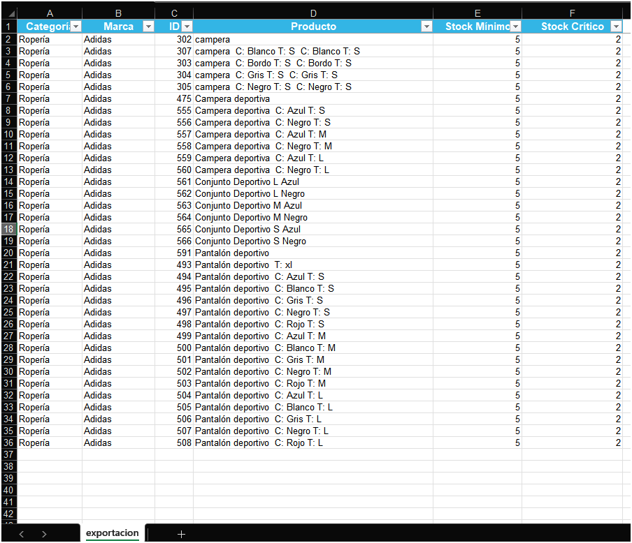 Stock igual o menor al crítico: en anaranjado.