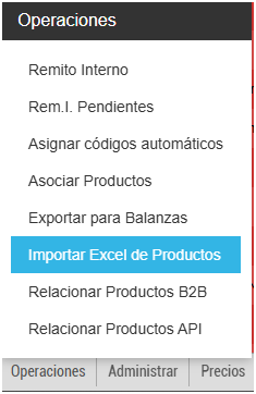 5) Ingresar nuevamente al sistema Cianbox, al Módulo Productos y buscar la función de Importar Excel de Productos, habiendo cliqueado previamente en el botón Operaciones: