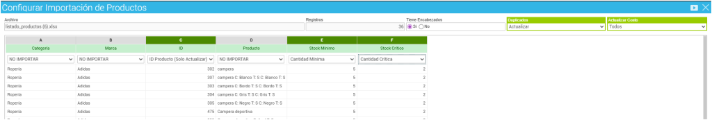 8) Una vez combinadas las columnas, cliquear en Importar Productos: