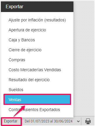 En la parte inferior seleccionar el ejercicio en el cual vamos a exportar los asientos, por ejemplo: “01/07/2023 al 30/06/2024”: