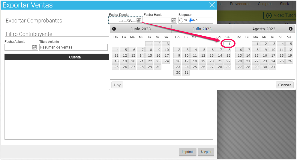 4) En la ventana “Exportar Ventas” seleccionar el rango de fechas a exportar: