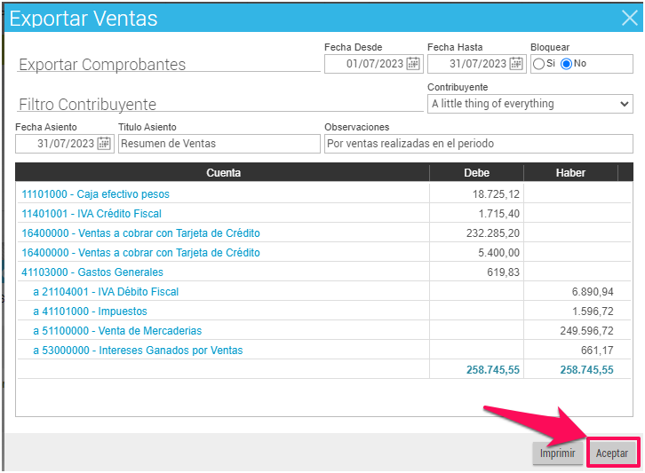 5) Una vez seleccionadas las fechas el sistema generará la vista previa del asiento. Clic en “Aceptar” para guardar el asiento: