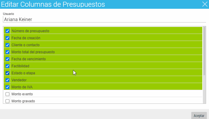 Modo rápido: Presupuestos >>> Opciones del Módulo >>> Columnas